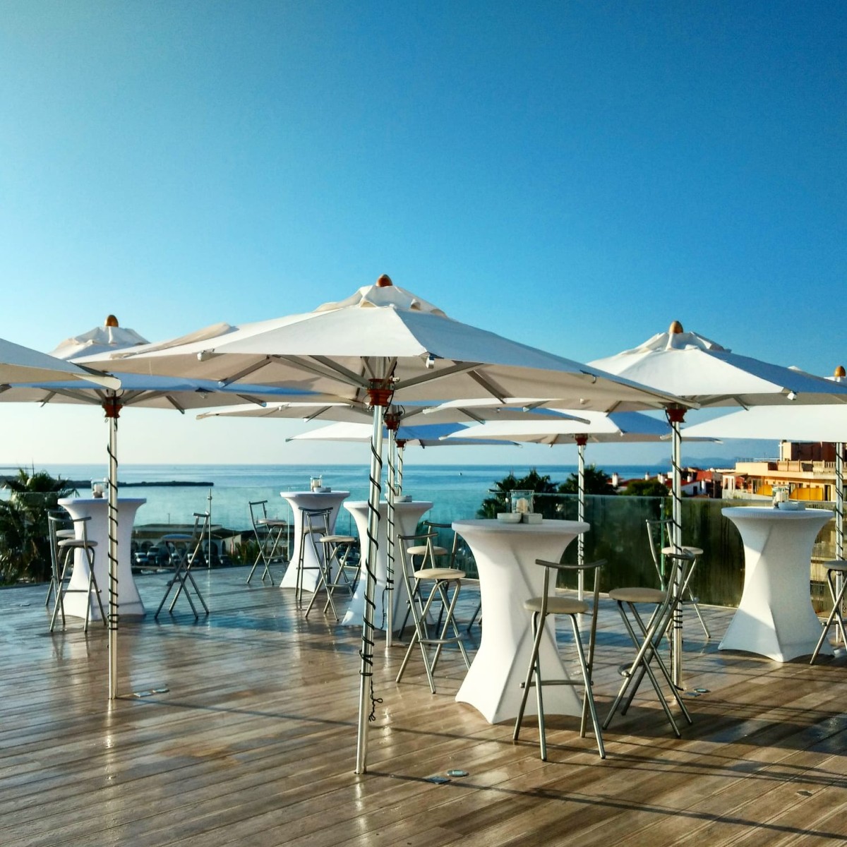 Durante el día, este espacio se transforma en un solarium junto a la piscina, mientras que cuando cae el sol, se sirven cócteles de autor y suena la música a cargo de djs de referencia, animando las noches de verano desde lo más alto.
